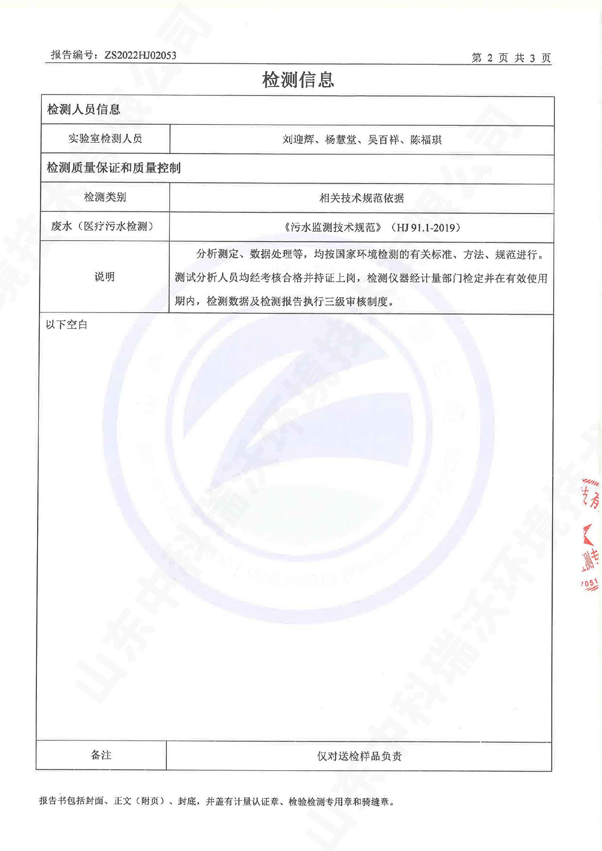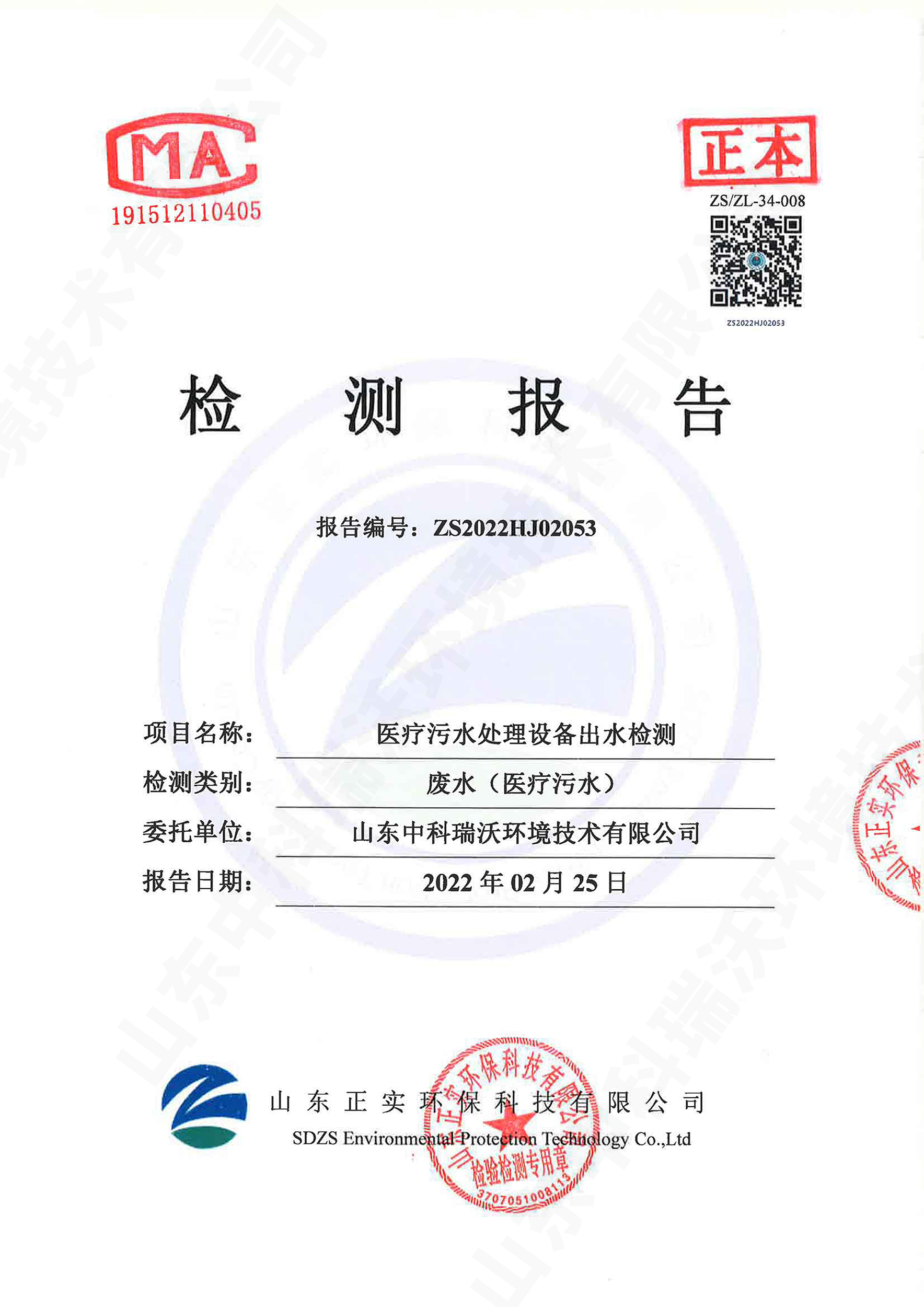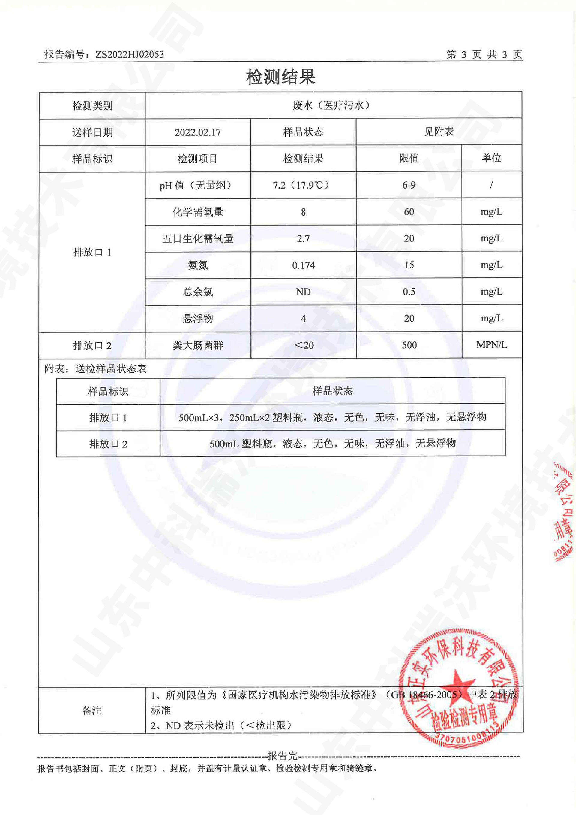 醫療污水處理設備出水檢測報告